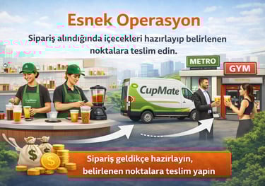 Cupmate’in Esnek Operasyon modeli, içecek hazırlama ve teslimat sürecinin sabit bir noktaya bağlı olmadan, siparişe göre dinamik şekilde yönetilmesini sağlar.