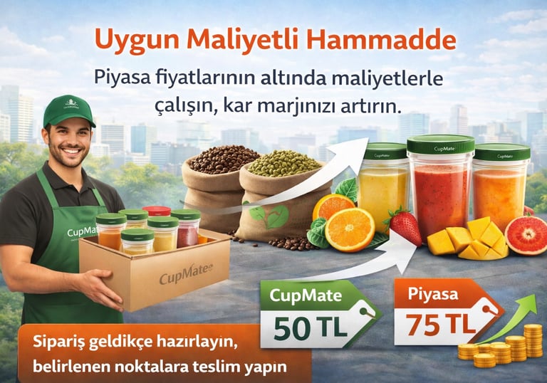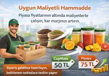 Cupmate, hammadde tedarikinde piyasa fiyatlarının altında maliyet avantajı sağlayarak daha verimli bir operasyon modeli oluşturur. Bu sayede içecek üretiminde kullanılan malzemeler daha ekonomik şekilde temin edilir.